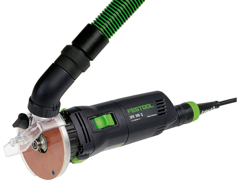 Chanfrar, arredondar, perfilar e rebaixar de modo uniforme, limpo e sem farpas com a fresadora para arestas OFK 500. Esta pesa só 1,4 kg e, com o centro de gravidade ideal, é especialmente prática até mesmo para aplicações verticais e horizontais. Especificidade da ferramenta é o sistema de fresagem: todas as ferramentas da fresadora para arestas têm o mesmo diâmetro exterior. Deste modo, foi possível reduzir a abertura da bancada da fresadora ao mínimo evitando o tombamento da fresadora na problemática área de canto.
