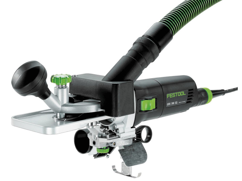Convincente tanto em linhas retas como em curvas: a fresadora para arestas OFK 700 é a mais polivalente entra as fresadoras para arestas. Esta torna a fresagem de acabamento de saliências de arestas e de superfícies num exercício muito simples não importa se a peça a trabalhar é pequena ou grande ou se as arestas são arqueadas ou direitas. A mesa de fresar grande, rapidamente comutável, assegura uma superfície de apoio estável e uma condução segura da ferramenta em qualquer posição de trabalho.