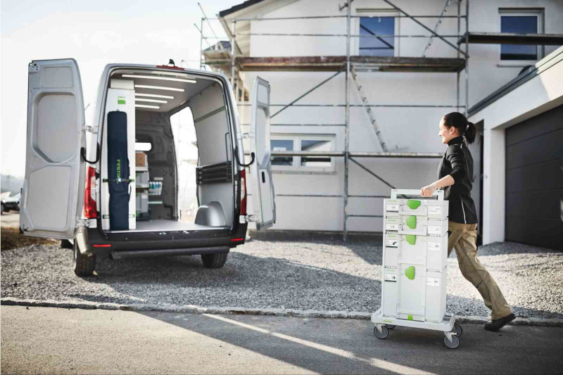 Graças ao acoplamento, o Systainer³ e o Systainer T-LOC podem ser fixados ao elemento de manuseamento central. Além disso, outros objetos e materiais podem ser simplesmente transportados na superfície plana e protegidos através das passagens para cintos tensores.