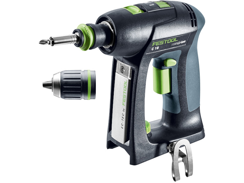Para furar e aparafusar com flexibilidade máxima: o ajuste do binário totalmente elétrico, o sistema de substituição rápida CENTROTEC, o adaptador angular e excêntrico, assim como o batente de profundidade dão resposta a qualquer aplicação de perfuração e aparafusamento. A combinação da bateria Li-HighPower com o motor EC-TEC, sem escovas e, por isso, isento de manutenção, tornam a aparafusadora de bateria C 18 leve, duradoura e resistente. Para um quotidiano sem preocupações, a aparafusadora de bateria e a bateria beneficiam da proteção completa do Festool Service. Disponível na construção única em C ou, se preferir, na construção em T também como T 18+3.