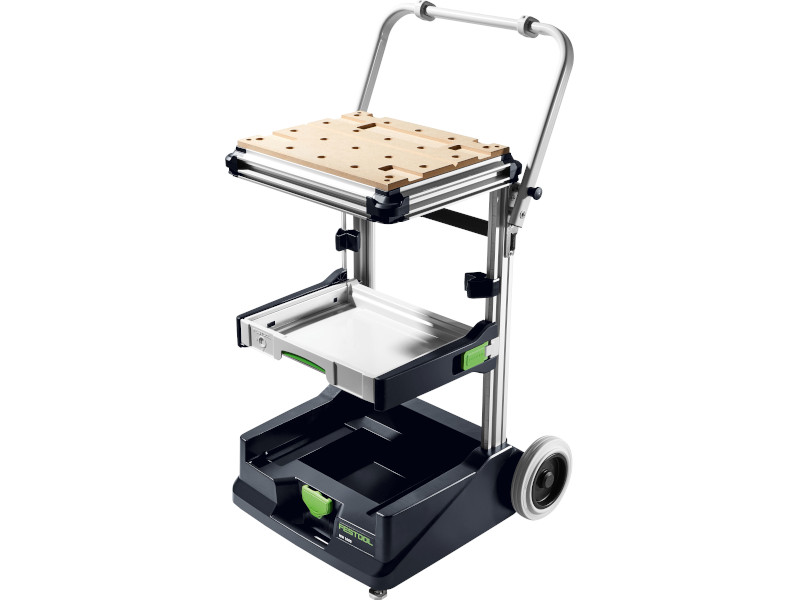 Excelente mobilidade em escadas, graças às grandes rodas revestidas a borracha e resistentes ao choque|Alça de empurrar de ângulo ajustável, superfícies de deslize e pega para um carregamento simples no veículo por uma pessoa|Montagem e desmontagem sem esforço e dimensões compactas|Áreas de armazenamento e superfícies de trabalho com opção de ampliação individual: possibilidade de adicionar várias bancadas multifuncionais e gavetas Systainer sem problemas|A superfície de trabalho estável, composta por placa perfurada e perfil de alumínio, oferece possibilidades de aperto e fixação flexíveis