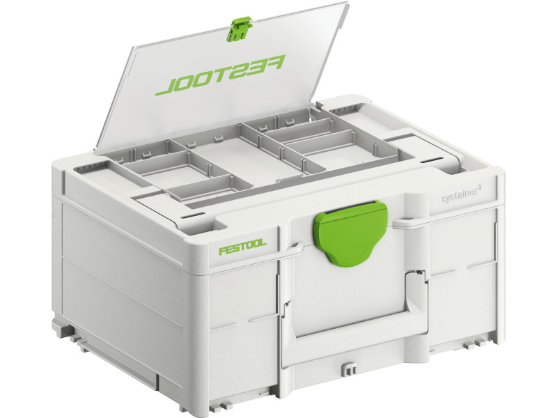 Peças pequenas organizadas de modo funcional no compartimento na tampa transparente|Flexibilidade máxima: com as separações, o compartimento na tampa pode ser dividido de forma variável|Compartimento na tampa compatível com estojos de bits e kits de brocas adequados|Também podem utilizar-se individualmente estojos de bits e kits de brocas para compartimento na tampa|Compatível com todo o sistema Systainer da Festool ? acoplamento e transporte fáceis