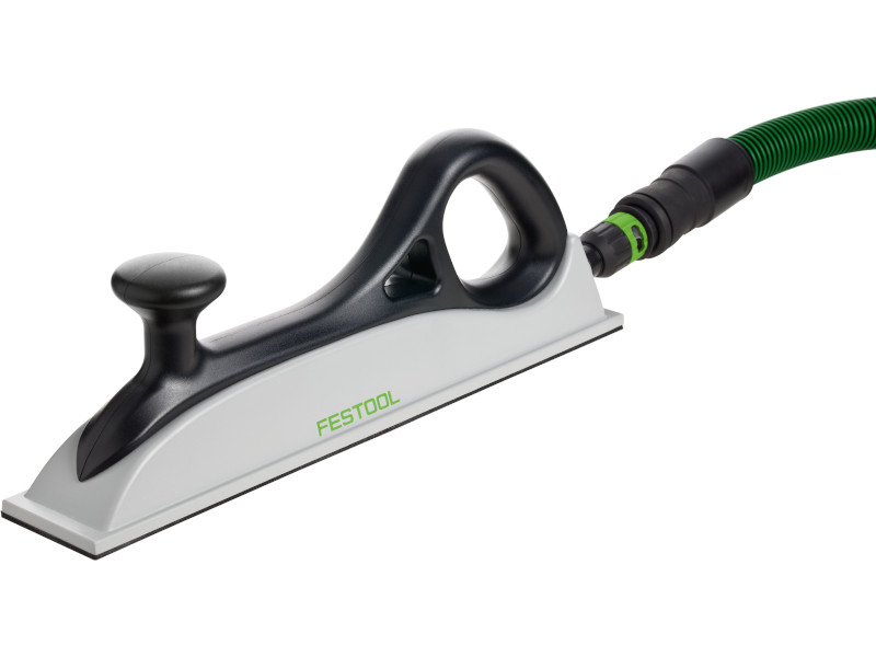 Adequação do desempenho de aspiração através da regulação bypass|A superf. não é danificada graças aos cantos arredondados da guarnição de velcro|O punho ergonómico com uma superfície fácil de agarrar impede a formação de bolhas nas mãos|Sapata com formato ergonómico, adequada aos tamanhos de lixa Festool 80 x 400 mm|Adaptador para tubos flexíveis Festool